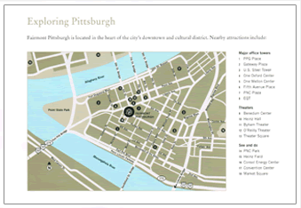 匹兹堡费尔蒙特酒店于2010年初开业,坐落于匹兹堡市文化和零售中心,是当地最新最美的豪华酒店。酒店周围剧院、运动场所和夜生活娱乐场所林立,费尔蒙特酒店其真正的核心所在,是其设计获得了美国绿色建筑协会授予的“能源与环境先导设计”称号(LEED)。